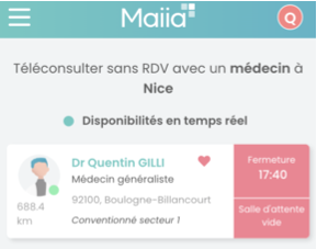 Dans l'image ci-dessous, le Dr Quentin Gilli est un médecin de la Téléconsultation classique sans rendez-vous. Toute prise de rendez-vous de Téléconsultation sur Maiia est forcément une téléconsultation classique.
