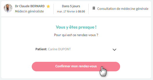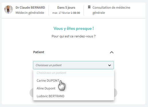 5. Choisissez le nom du patient qui va se présenter au rendez-vous; soit votre nom soit le nom d'un proche (Voir article : Ajouter un proche) :