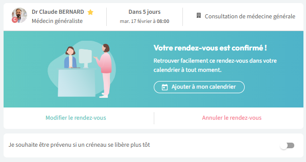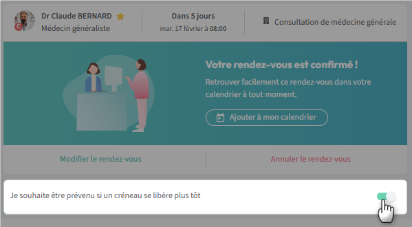 Remarque : Si vous avez validé un rendez-vous au-delà de 15 jours et que vous avez besoin d'un rendez-vous plus tôt; il est possible d'activer le bouton "Je souhaite être prévenu si un créneau se libère plus tôt".