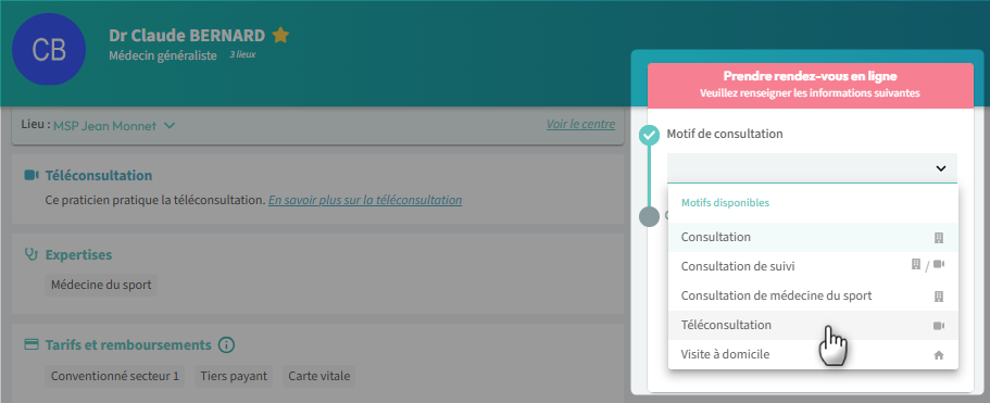 2. Sélectionnez un motif de consultation disponible à la Téléconsultation (repéré par icone caméra) :