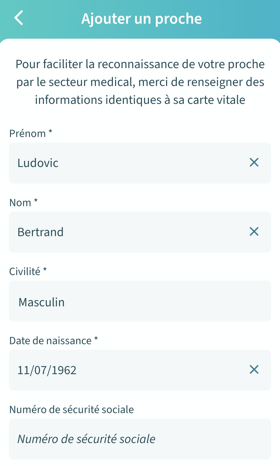 Afin de faciliter la reconnaissance du proche par le secteur médical, les informations doivent être identiques à celles enregistrées sur sa carte vitale.