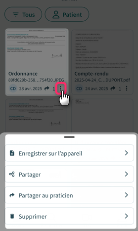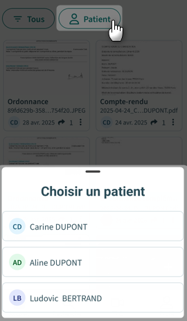 3. Juste à côté, vous verrez le bouton "Patient". En cliquant dessus, vous pourrez afficher tous les documents de l'ensemble des patients liés à ce compte. Si vous souhaitez voir les documents d'un patient spécifique, vous pouvez également cliquer sur ce bouton et sélectionner son nom.
