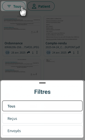 2. Dans l'onglet "Mes documents", vous voyez par défaut tous les documents partagés avec vos praticiens. Si vous souhaitez voir uniquement les documents que vous avez reçus ou ceux que vous avez envoyés, cliquez sur le bouton "Tous". Un menu apparaîtra avec les options de filtrage : 'Reçus', 'Envoyés', ou 'Tous' pour revenir à l'affichage complet :