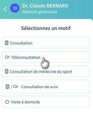 NB : Il est possible d'avoir les deux icones "" pour le même motif de rendez-vous, cela signifie que votre praticien vous laisse le choix entre un rendez-vous en téléconsultation ou en présentiel pour ce motif.