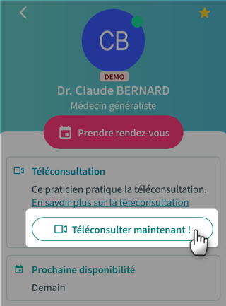 - Si vous réalisez une téléconsultation sans rendez-vous il vous suffit de cliquer sur le bouton "Téléconsulter maintenant" depuis sa fiche praticien :