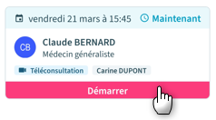 - Si vous avez déjà validé un rendez-vous en téléconsultation vous cliquez sur le bouton "Démarrer" ce bouton apparait 15min avant l'heure du rendez-vous :