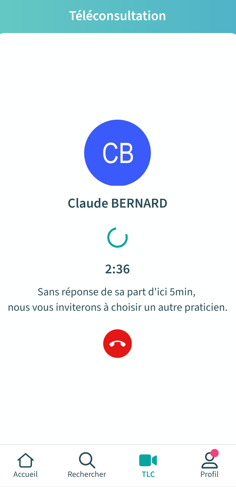 - Si votre praticien ne fait aucune action de son côté dans les 5 minutes, l'appel sera automatiquement coupé. Vous devrez alors :