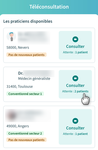 2. Puis choisissez un des praticiens disponibles pour démarrer la téléconsultation immédiate, les praticiens sont classés par localisation géographique :
