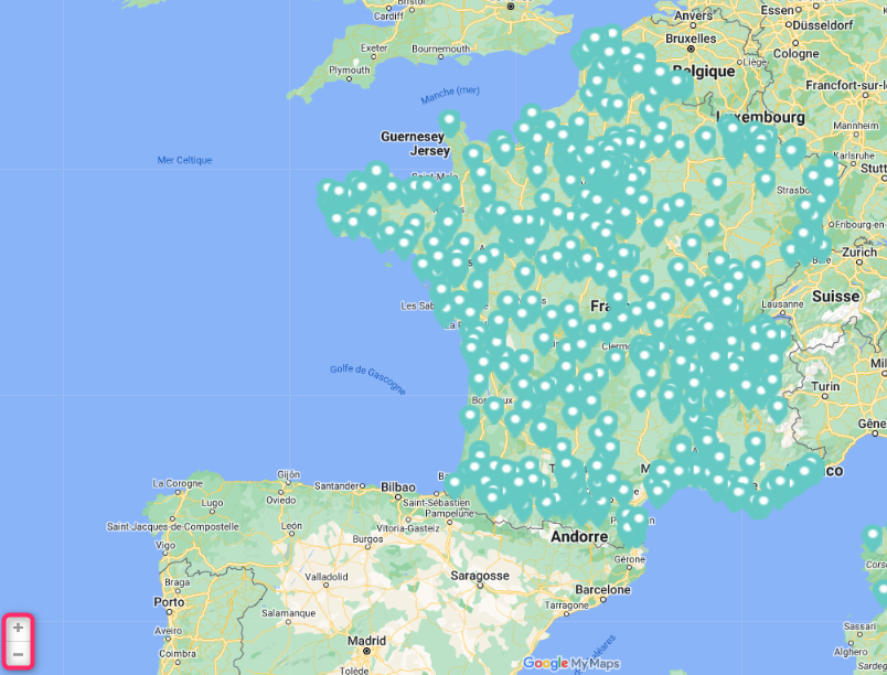 3. Une carte des pharmacies partenaires Maiia apparait, cliquez sur le "+" pour visualiser votre région puis recherchez la pharmacie la plus proche de chez vous :