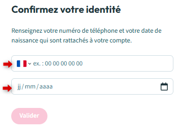 - Insérez votre numéro de portable et votre date de naissance, puis validez :